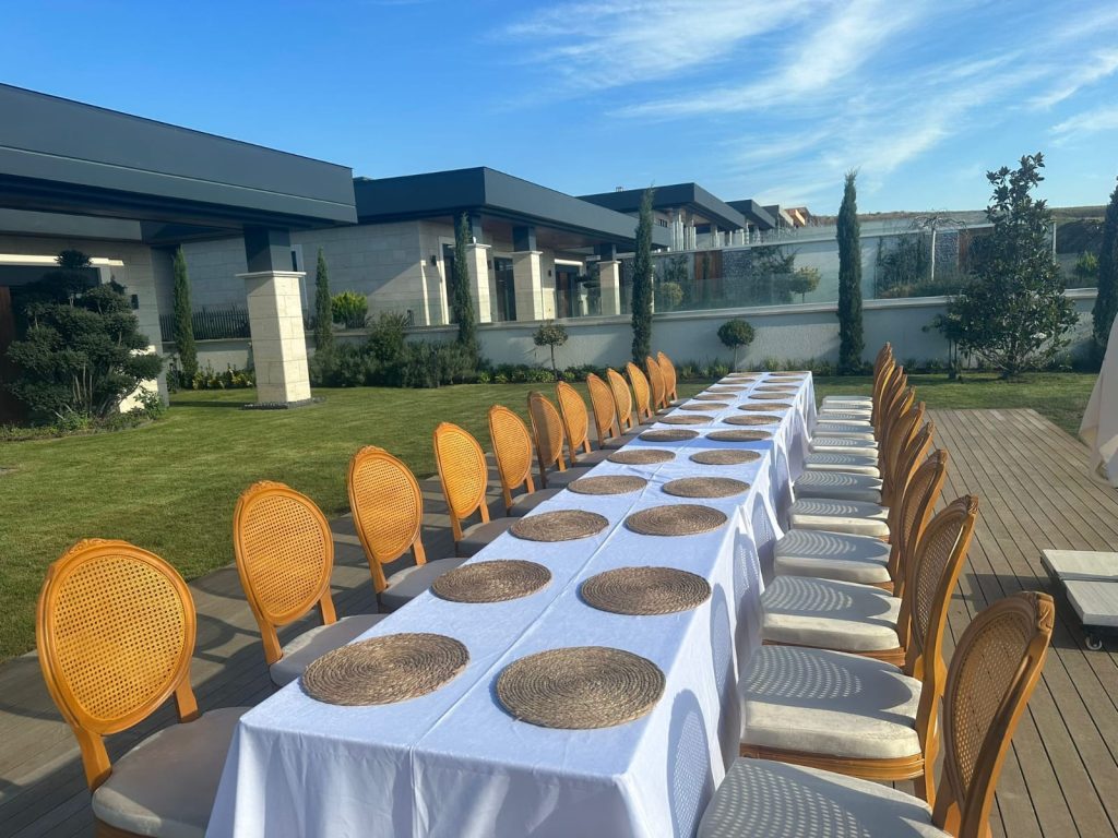 | Villa Bahçesinde Yemekli Düğün Töreni | 150 kişilik masa sandalye kurulumu, ana yemekli menü (et, vejetaryen), serpme meze, tatlı, içecek servisi, gelin yolu, ışıklandırma, 4 garson, 2 hostes, canlı müzik. | 74.500 TL |