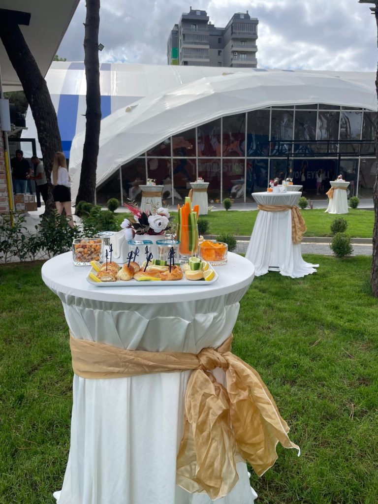 | Eyüpsultan 80 Kişilik Kokteyl Paketi | – Taze kanepeler, mini sandviçler, tuzlu ve tatlı ikramlar – 6 adet bistro masa, masa örtüsü ve uyumlu fiyonk süsleme – Limitsiz çay, kahve, meşrubat servisi – 2 garson, 1 karşılama hostesi – Profesyonel kurulum, nakliye ve toplama hizmeti dahil | 29.900 TL |