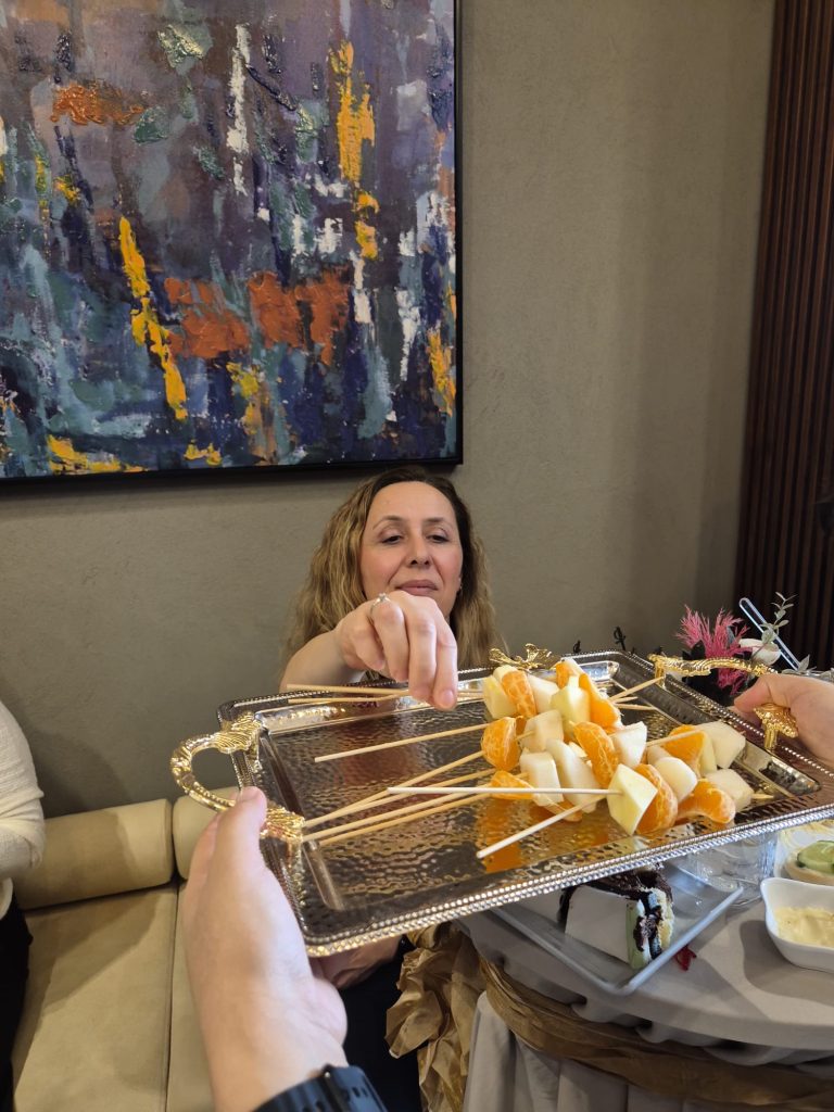 - İkram masası kurulumu, porselen ve cam sunumlar