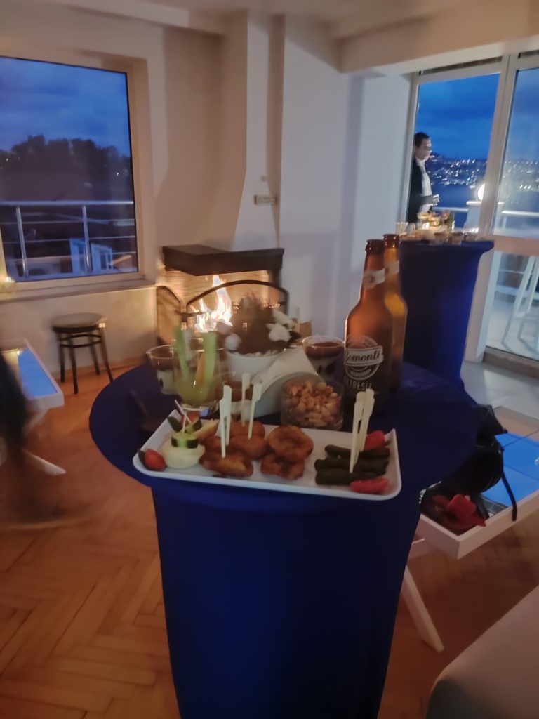 Catering hizmeti kısmında ise soğuk kanepelerden sıcak ara sıcaklara, tatlı standından meyve barına kadar her sunum steril mutfakta hazırlanır, porselen tabak ve cam bardakla servis edilir.