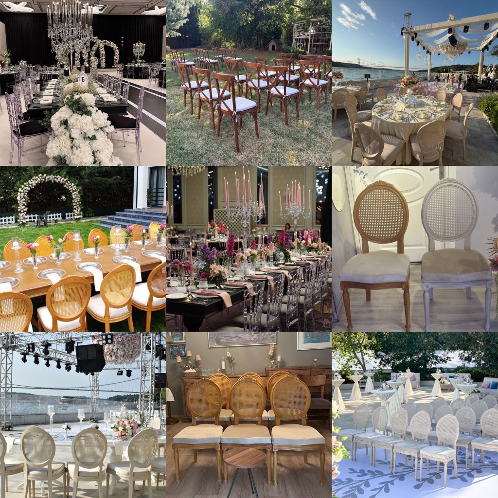 Masa sandalye kiralama, arka fon süsleme, gelin yolu, balon dekor, trio müzik, DJ performansı, günlük taze catering, zengin ikramlıklar ve stand kokteyl sunumları tek elden sağlanır.